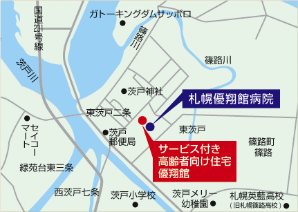Googleマップで優翔館(札幌市北区東茨戸2条2丁目7番30号)を見る。