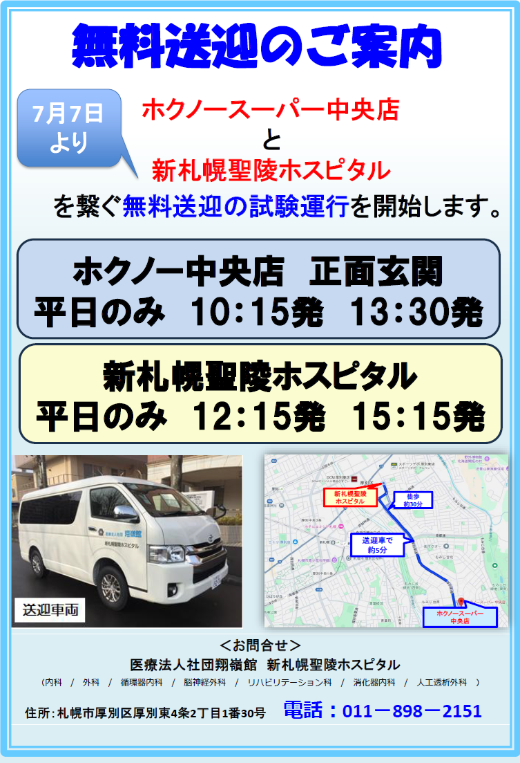新札幌聖陵ホスピタルを繋ぐ無料送迎を開始いたします。