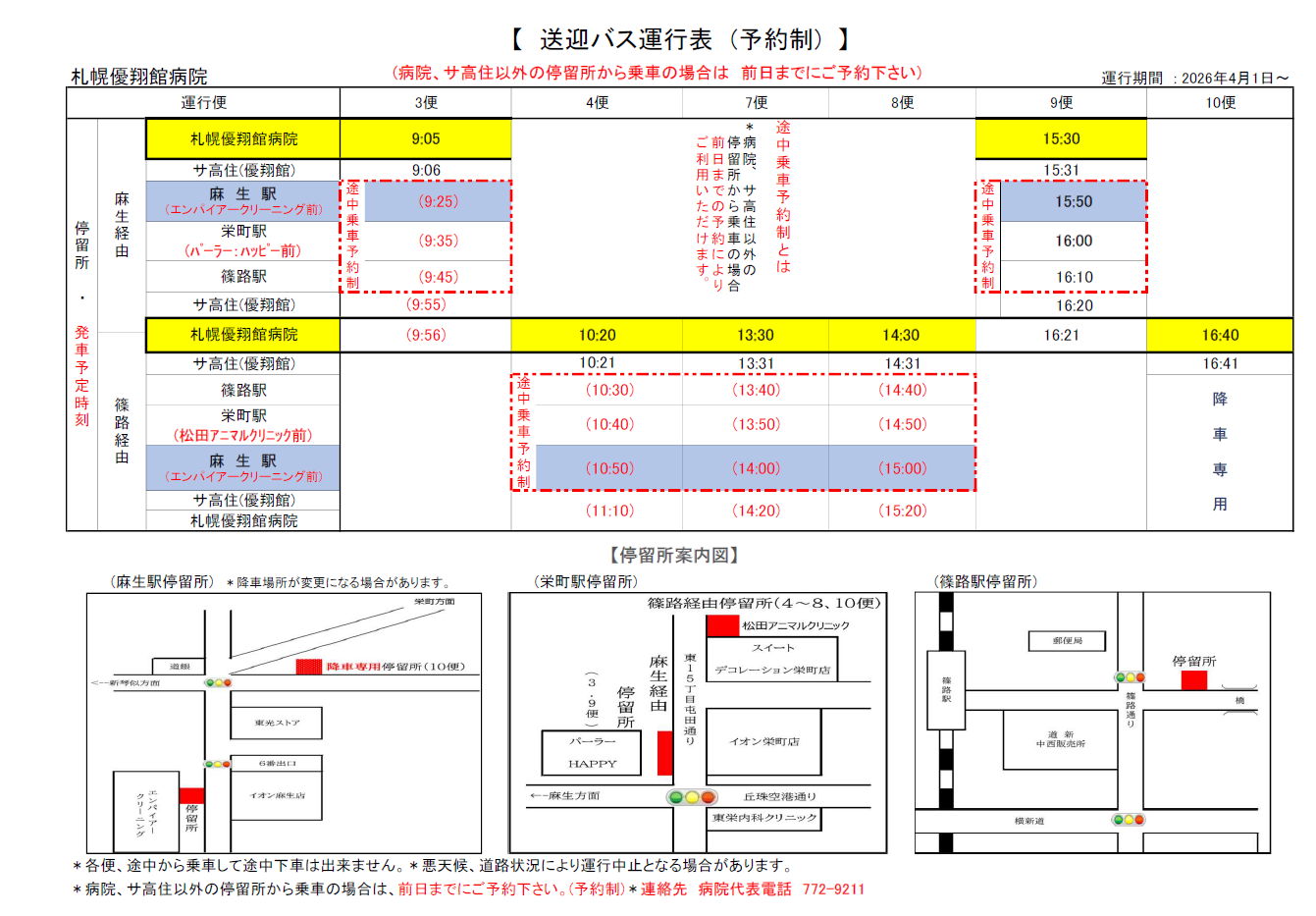 ご利用の際は予約が必要です。 ☎ 011-772-9211までお問合せください。 ※ご予約がない場合、送迎バスに乗ることはできません。